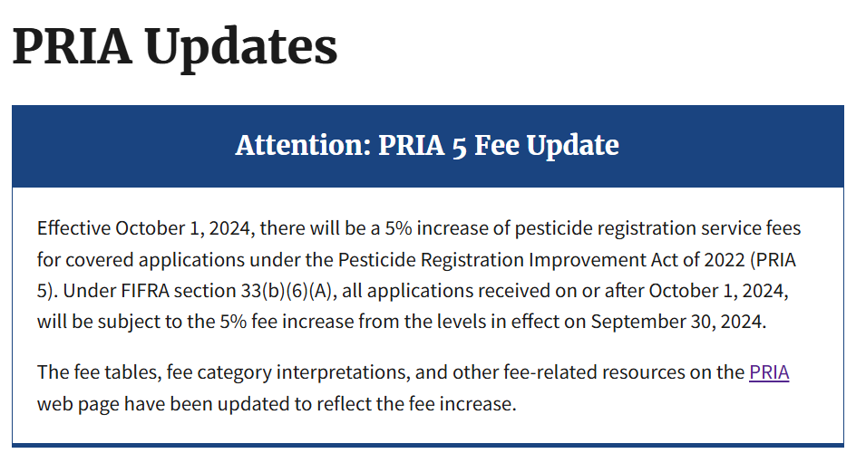 美國環境保護署(EPA)根據《農藥登記改進法案》(PRIA 5)的規定,正式宣布自2024年10月1日起,將對依據《聯邦昆蟲殺蟲劑、殺菌劑和殺鼠劑法》(FIFRA)第33(b)(6)(A)條收到的所有新登記申請增收5%的農藥登記評審費。