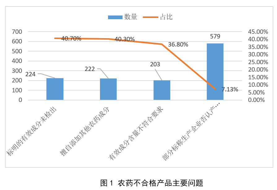 近日農業農村部辦公廳發布了關于2018年全國農藥監督抽查結果的通報。本次抽查按照“雙隨機一公開”的要求,采取例行抽查、重點抽查、專項抽查的方式抽取農藥樣品,重點抽樣檢測了蔬菜、果樹、茶樹、水稻、小麥、玉米、棉花、大豆等作物用藥,涉及29個省(區、市)和境外生產企業的8119個農藥樣品,其中質量合格樣品7568個,占比93.2%;不合格樣品551個,占比6.8%。不合格樣品中檢出假農藥(標明的有效成分未檢出或擅自加入其他農藥成分)370個,占檢測樣品總數的4.6%,占不合格樣品的67.2%。不合格農藥產品主要存在以下問題:(1)標簽中標明的有效成分未檢出;(2)擅自添加其他農藥成分,甚至添加高毒農藥、百草枯等;(3)有效成分含量不符合要求;(4)部分標稱生產企業否認產品由其生產。具體分析見圖1。