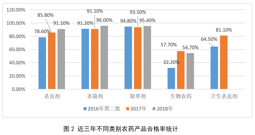 農藥監督抽查作為農藥產品市場監管的有效措施,在確保農作物重大病蟲害有效防治,保障農藥質量安全以及農產品質量安全等方面,發揮著重要的作用。近幾年來,由于行政審批制度變革,監管重心從“重審批、輕監管”轉向“寬準入、嚴監管”,執法部門對農藥產品的監督抽查力度也在不斷加大。2016年抽檢農藥樣品5475個,合格樣品4695個,合格率85.8%,不合格樣品780個,不合格率14.2%;2017年抽檢農藥樣品5029個,合格樣品4472個,合格率為88.9%。不合格樣品557個,不合格率為11.1%。通過與2018年的抽檢結果比較,可以發現農藥產品的合格率近三年在逐年提高。瑞旭集團同時整理了近三年不同類別農藥產品,如殺蟲劑、殺菌劑、除草劑、生物農藥、衛生殺蟲劑產品的合格率數據,詳情見圖2,發現同類產品合格率也呈上升趨勢。