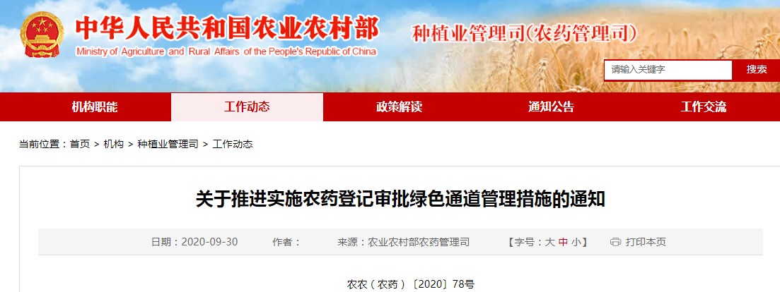 2020年9月30日,農業農村部農藥管理司為貫徹落實國務院“放管服”改革精神,發布了關于推進實施農藥登記審批綠色通道管理措施的通知。在確保產品高效安全的前提下,加快生物農藥、高毒農藥替代產品、特色小宗作物用藥登記審批進程,促進農藥高質量發展和綠色發展。
