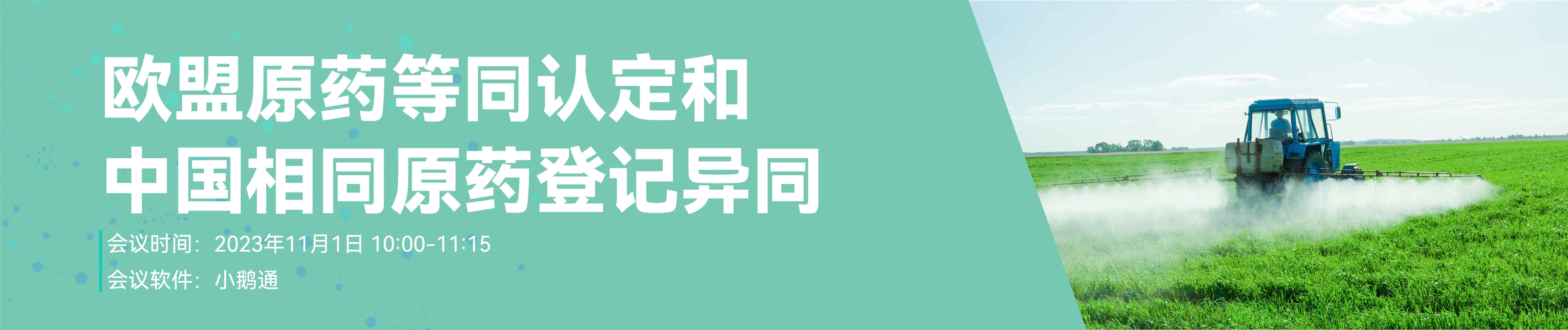 中文 | 2023年11月1日 | 10:00 -11:00AM | 歐盟原藥等同認定和中國相同原藥登記的異同 丁平 女士 瑞旭集團農化事業部總經理 |