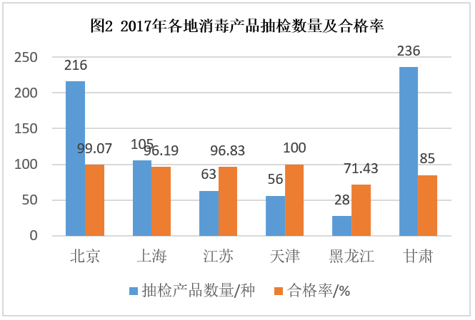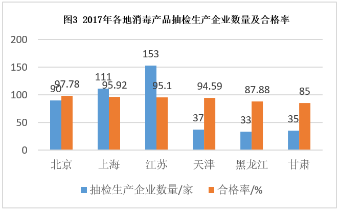 2017年國家監督抽檢任務以“雙隨機”形式進行,同時發布了相應的抽檢計劃,對監督抽查對象、抽檢內容、檢測項目進行了規定和指導。瑞旭集團整理了北京、上海、江蘇、天津、黑龍江、甘肅等地消毒產品抽檢結果,詳情見圖2、圖3。產品不合格的原因主要包括標簽說明書不符合《消毒產品標簽說明書管理規范》的規定、微生物指標不達標;生產企業抽檢發現的主要問題包括衛生許可證、凈化生產車間條件、出廠檢驗報告等不合格。