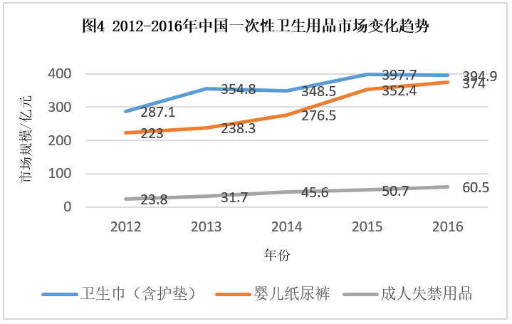 2)一次性衛生用品強大的市場需求量與快速增長率。根據中國造紙協會生活用紙專業委員會統計,2016年我國一次性衛生用品市場規模已達到829.4億元,據行業預測:到2020年僅衛生巾(含護墊)的市場規模將達到611.0億元。