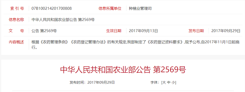 根據《農藥管理條例》《農藥登記管理辦法》的有關規定,農業部制定了《農藥登記資料要求》,現予公布,自2017年11月1日起施行。