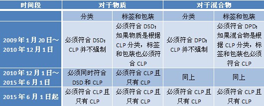 CLP法規逐步實施的具體時間表以及內容請參見下表: