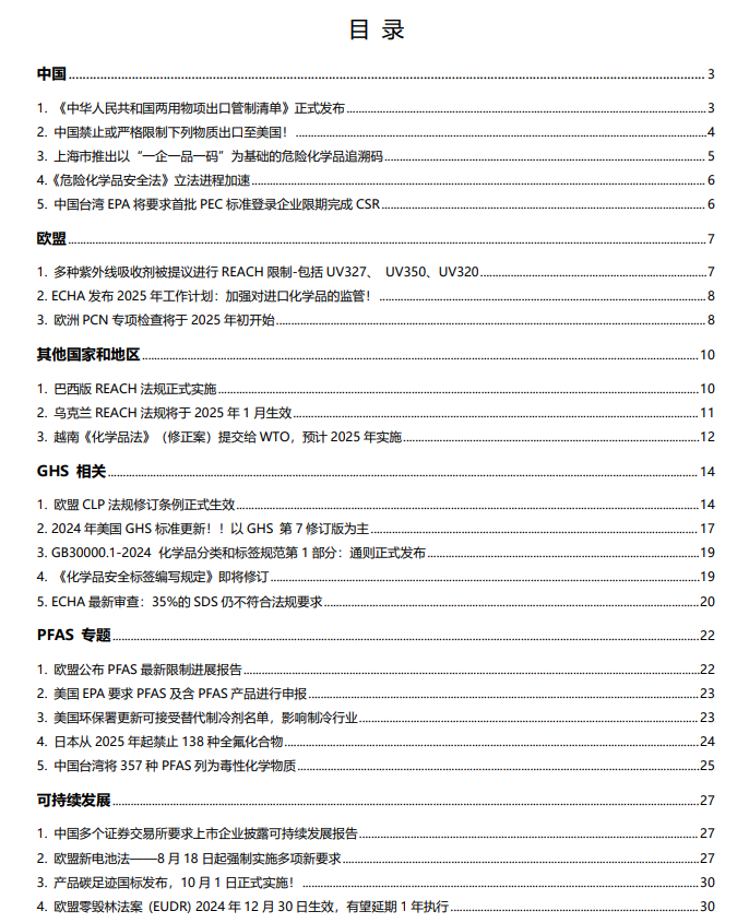 - PFAS專題:深入探討了全球對PFAS(全氟和多氟烷基物質)的限制進展,包括歐盟、美國、日本和中國臺灣的最新政策。
