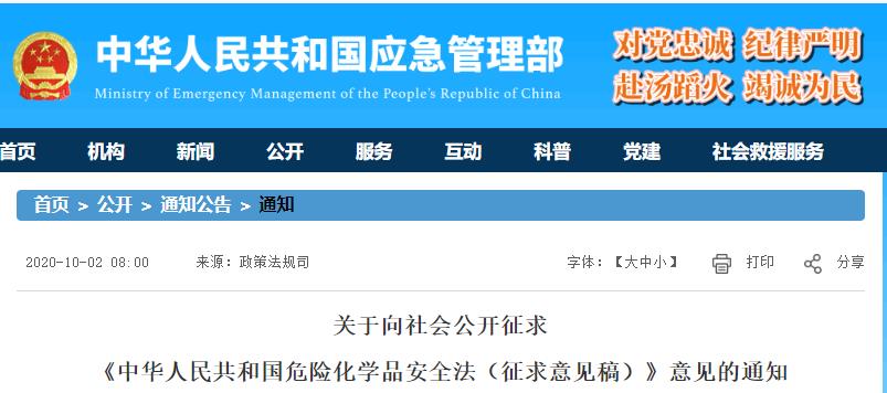 10月2日,應急管理部政策法規司為了加強危險化學品的安全管理,預防和減少危險化學品事故,特組織起草了《中華人民共和國危險化學品安全法(征求意見稿)》,現向社會公開征求意見。公眾可以通過以下途徑和方式提出反饋意見:通過電子郵件方式將意見發送至:yjbzfs@163.com。意見反饋截止時間為2020年11月1日。