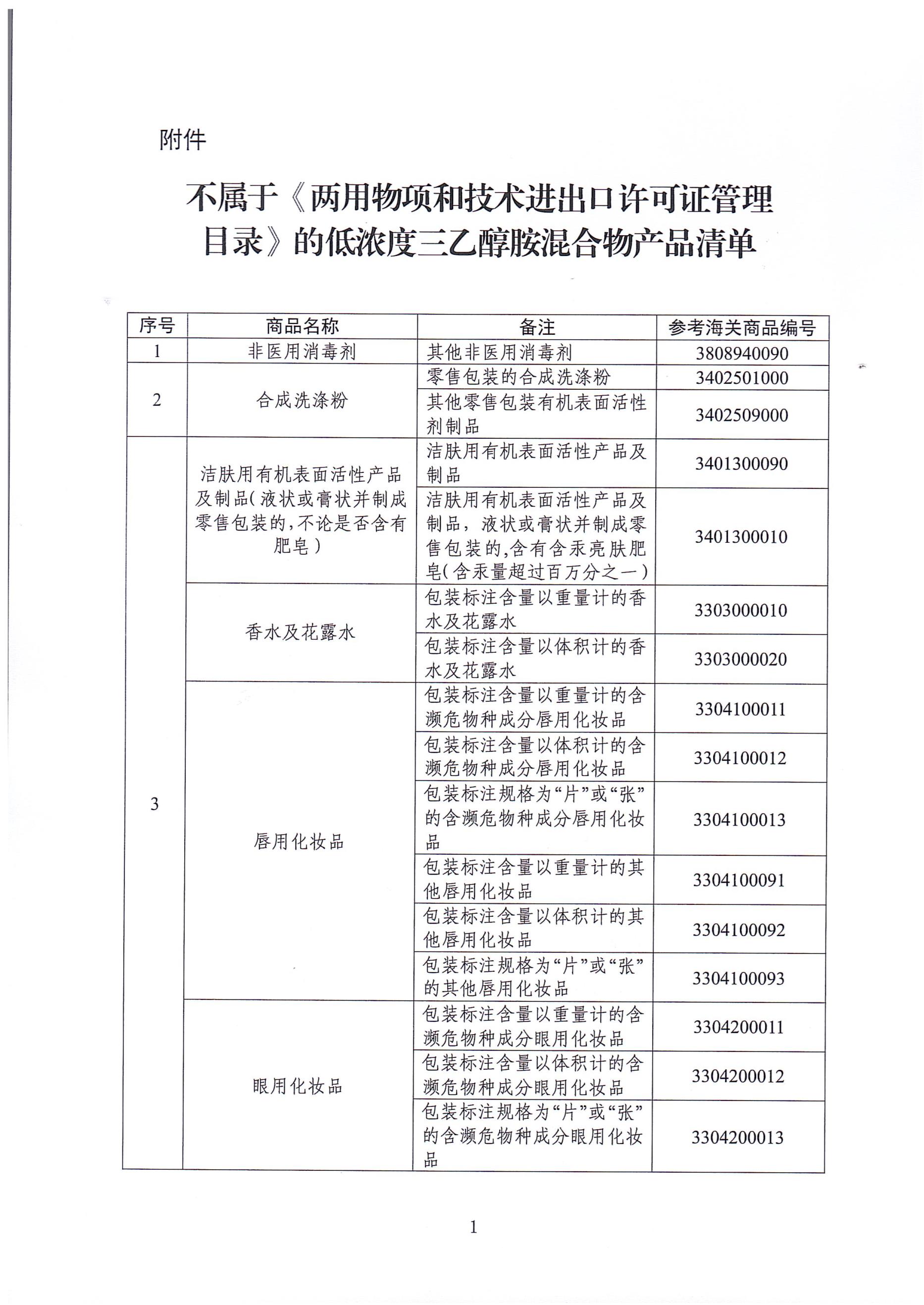 三乙醇胺含量較低的非醫用消毒劑、合成洗滌粉、化妝品、墨水等消費類商品(詳見附件),防擴散風險可控,不屬于《兩用物項和技術進出口許可證管理目錄》中三乙醇胺(海關商品編號2922150000)和三乙醇胺混合物(海關商品編號3824999950)項下的管控物項,無需辦理監控化學品進出口審批手續,無需辦理兩用物項和技術進出口許可。