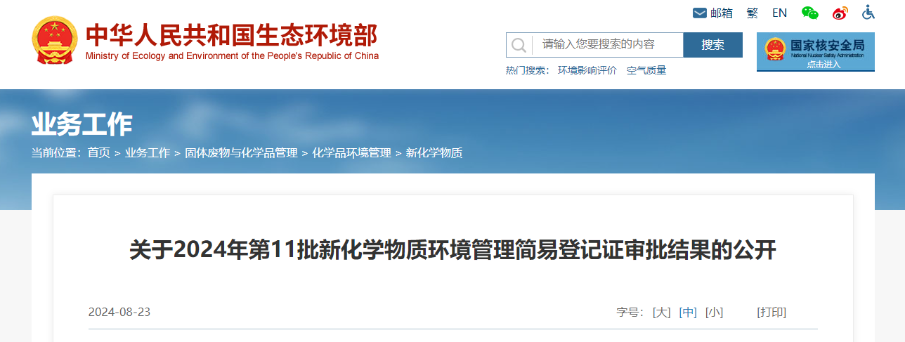 按照《中華人民共和國政府信息公開條例》(國務院令第711號)的要求,現將2024年第11批新化學物質環境管理簡易登記證審批結果予以公開。