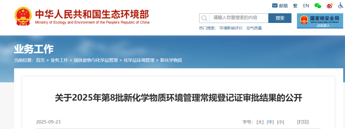 按照《中華人民共和國政府信息公開條例》(國務院令第711號)的要求,現將2025年第8批新化學物質環境管理常規登記證審批結果予以公開。