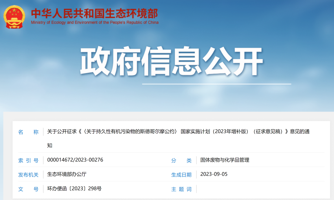 關于公開征求《〈關于持久性有機污染物的斯德哥爾摩公約〉 國家實施計劃(2023年增補版)(征求意見稿)》意見的通知