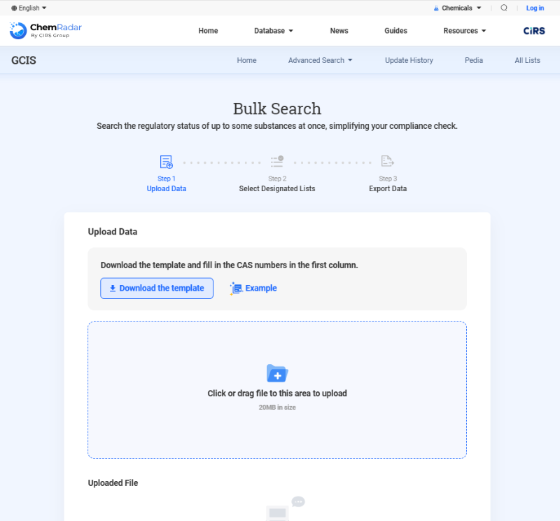 研發團隊、法規事務部、質量審核部常常需要在短時間內完成大批量物質的合規篩查。Chemradar全新批量查詢功能支持用戶自定義名錄范圍,單次最高可同時檢索 1000 個物質。僅需上傳template 文件,系統即可在數十秒內返回結構化的合規結果。