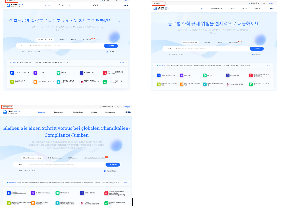 語言不再是壁壘,而是橋梁。借助領先的多語言 AI 翻譯模型,化規通首次將平臺語言拓展至日語、韓語、德語三大版本,與原有的中英文界面共同組成“五語矩陣”。點擊頁面左上角即可自動切換。