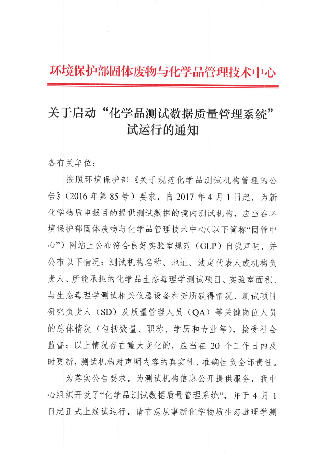 關于啟動“化學品測試數據質量管理系統”試運行的通知