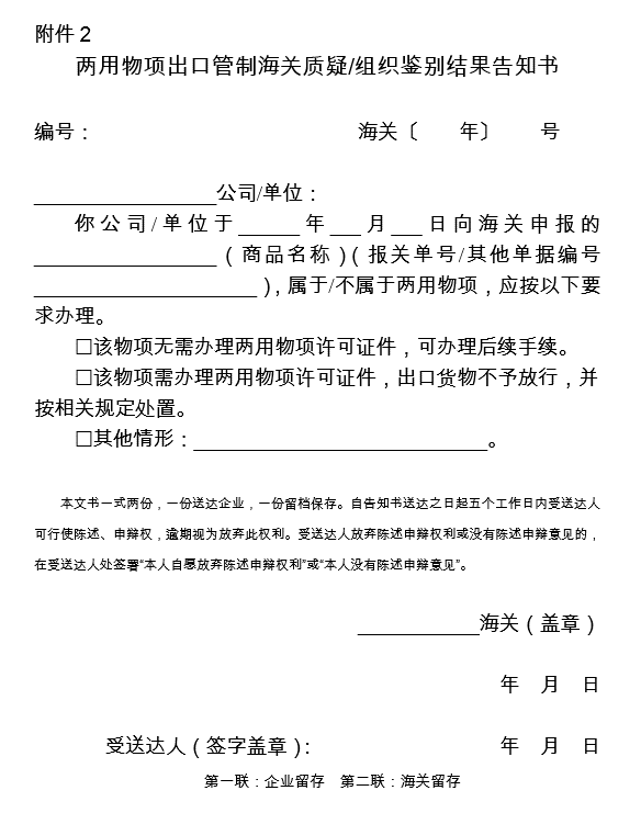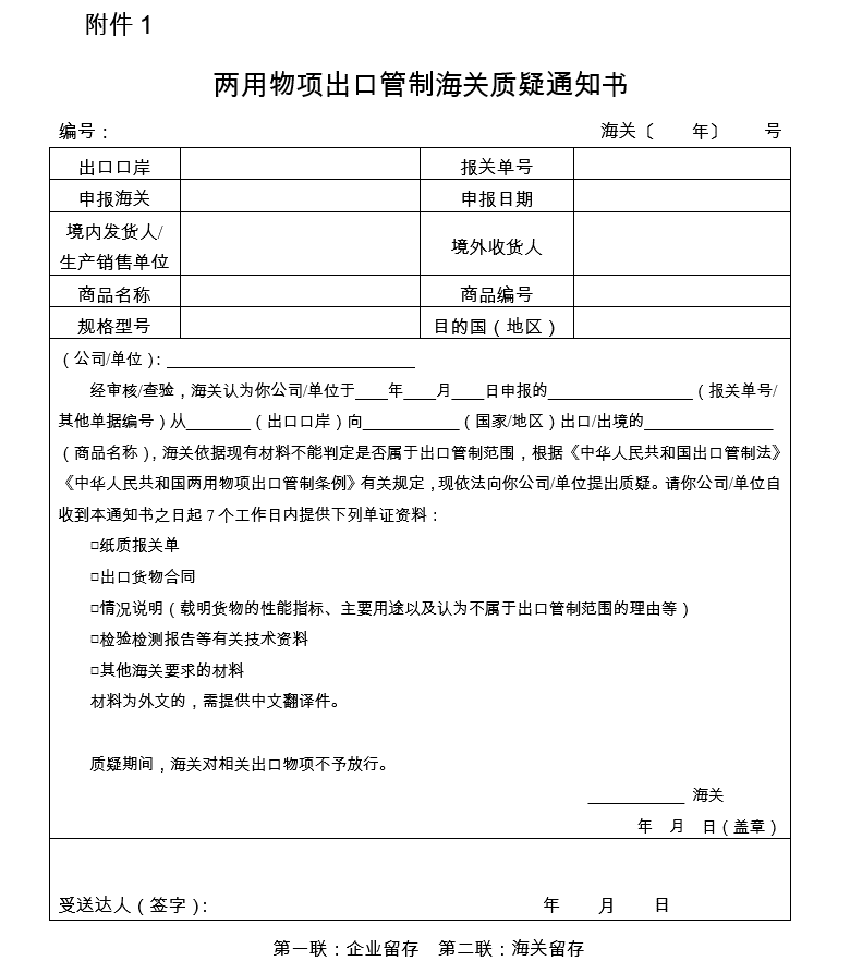 出口貨物發貨人未向海關交驗國家出口管制管理部門許可證件,且海關有證據表明貨物可能屬出口管制范圍的,海關應當向發貨人提出質疑,并制發《兩用物項出口管制海關質疑通知書》(附件1)。