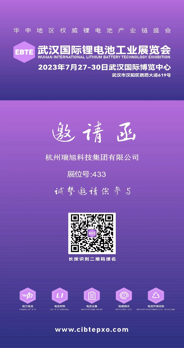 2023武漢國際鋰電工業展(簡稱“EBTE ”)將于2023年7月27日-30日在武漢國際博覽中心舉行!杭州瑞旭集團在展位:433 等候您的光臨。