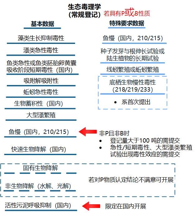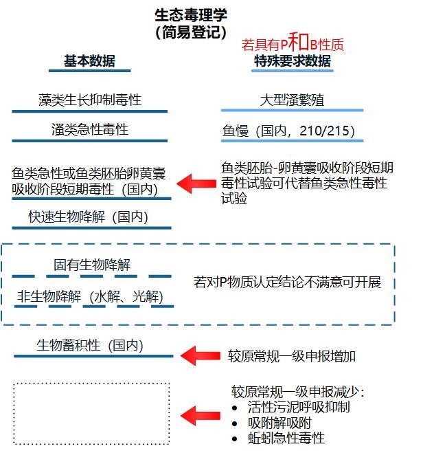 簡易登記生態毒理學基本數據包括:藻類生長抑制、溞類急性、魚類急性或魚類胚胎-卵黃囊吸收階段短期毒性、降解性和生物累積性。對于同時具有P和B物質,需提交生態毒理學特殊要求數據,包括:大溞繁殖和魚類慢性。