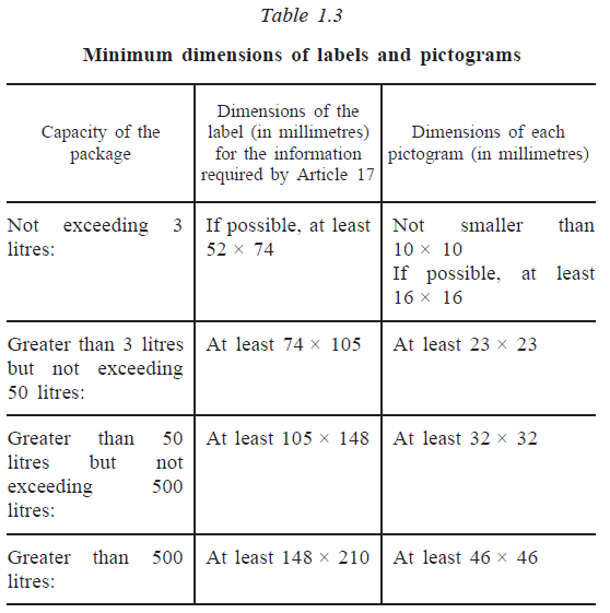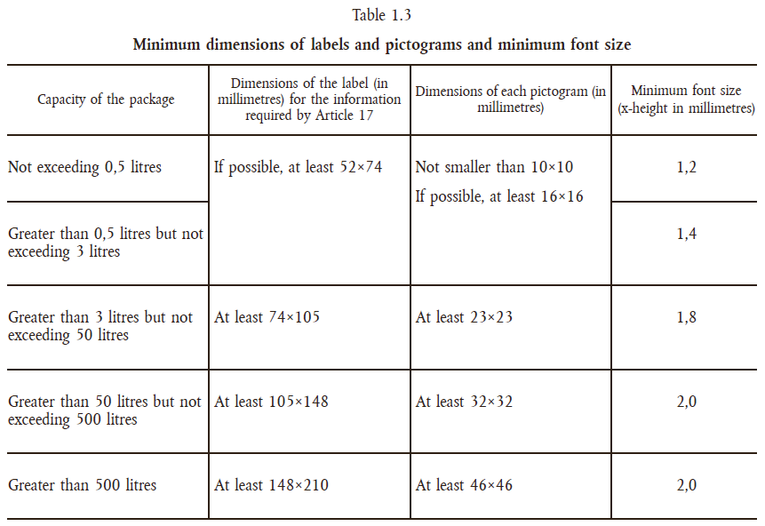 對于容量≤10ml的內包裝標簽,字體大小可以小于表中的字體大小,只要它清晰易讀,放置危險性說明或EUH說明等關鍵說明至關重要,前提是外包裝符合CLP Article 17相應要求。同時此類產品符合一定要求的情況下(如:R&D用途等),Article 17要求的內包裝標簽元素信息可以從內包裝上省略。
