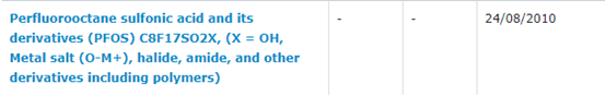 通過鏈接: https://echa.europa.eu/list-of-substances-subject-to-pops-regulation 即可獲取物質是否列入POPs管轄范圍。我們可以看到,PFOS這類產品早在2010年就已經進行了嚴格的管理:禁止生產,投放市場和使用。