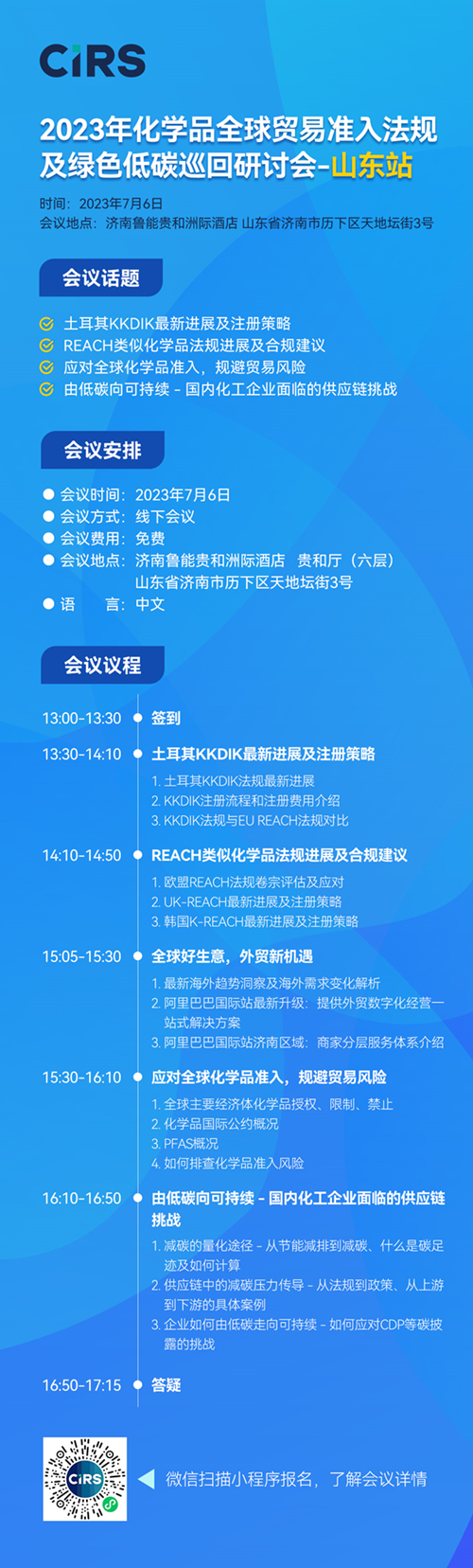 瑞旭集團將于2023年7月6日在山東舉辦全球貿易準入法規及綠色低碳巡回研討會,助力企業在全球貿易過程中,抓住外貿新機遇,盡可能降低產品的準入風險,歡迎掃碼報名參加。