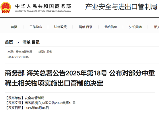 2025年4月4日,商務部、海關總署兩部門發布2025年第18號公告,決定對部分中重稀土相關物項實施出口管制,全文如下:
