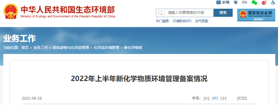 生態環境部發布2022年上半年新化學物質環境管理備案情況