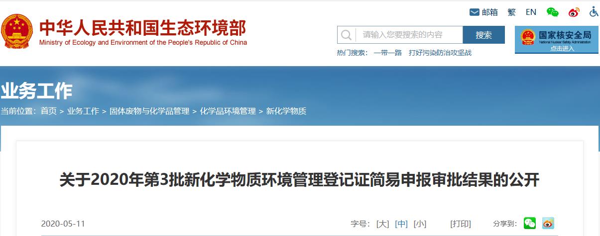 2020年5月11日,生態環境部按照《中華人民共和國政府信息公開條例》(國務院令492號)的要求,現將2020年第3批新化學物質環境管理登記證簡易申報審批結果予以公開。