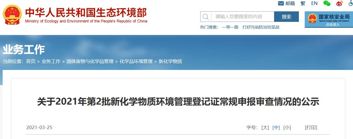 這些獲得受理號的物質中有7項為“重點環境管理危險類”,10項為“危險類”,3項為“一般類”。根據《辦法》第二十條,現將擬批準的《新化學物質環境管理登記證》申請相關情況予以公示。公示時間:2021年3月25日-27日。公示期間設立聯系電話和郵箱:電話:010-65645763傳真:010- 65645781