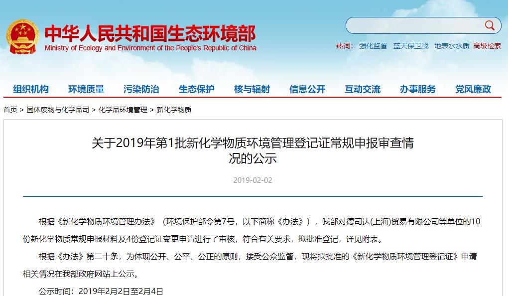 2019年2月2日,根據《新化學物質環境管理辦法》(環境保護部令第7號,以下簡稱《辦法》),生態環保部對德司達(上海)貿易有限公司等單位的10份新化學物質常規申報材料及4份登記證變更申請進行了審核,符合有關要求,擬批準登記,詳見附表。