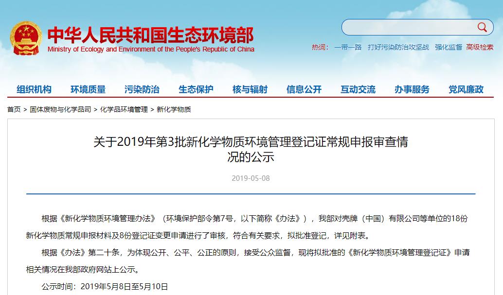 2019年5月8日,根據《新化學物質環境管理辦法》(環境保護部令第7號,以下簡稱《辦法》),生態環保部對殼牌(中國)有限公司等單位的18份新化學物質常規申報材料及8份登記證變更申請進行了審核,符合有關要求,擬批準登記,詳見附表。