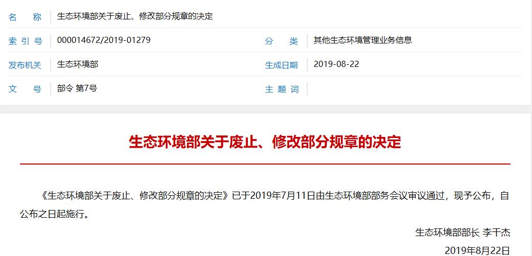 2019年8月22日,生態環境部發布《生態環境部關于廢止、修改部分規章的決定》,其通知已于2019年7月11日由生態環境部部務會議審議通過,現予公布,自公布之日起施行。