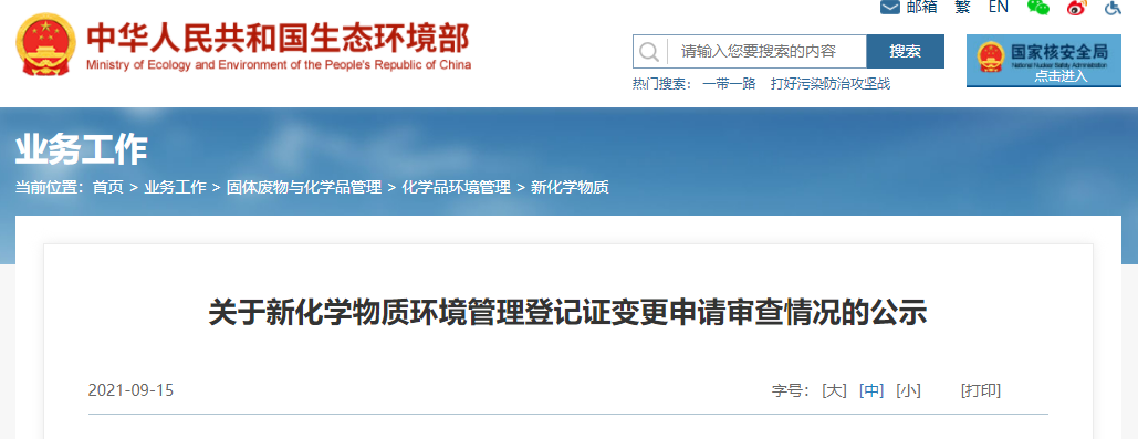 - 生態環境部發布關于新化學物質環境管理登記證變更申請審查情況的公示