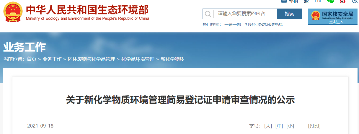 - 生態環境部發布關于2021年第3批新化學物質環境管理登記證簡易申報和登記證變更審批結果