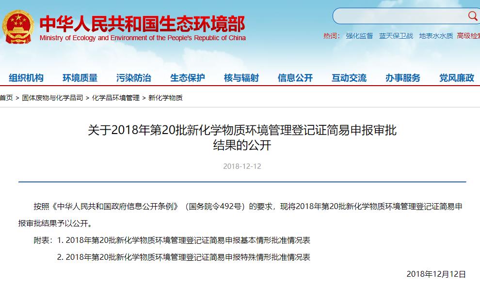 2018年12月12日,生態環境部按照《中華人民共和國政府信息公開條例》(國務院令492號)的要求,現將2018年第20批新化學物質環境管理登記證簡易申報審批結果予以公開。
