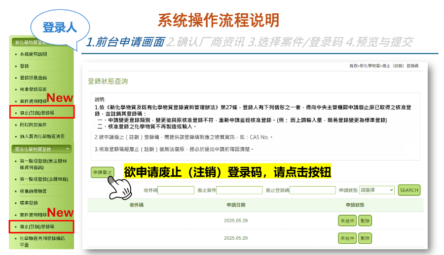 屆時登錄人/代理人可登錄平臺(https://tcscachemreg.moenv.gov.tw),進入“廢止(注銷)登錄碼”模塊在線提交申請。對于登錄人自行完成登錄和/或由代理人協助完成登錄的登錄碼,有不同的操作要求,詳見圖1-8。