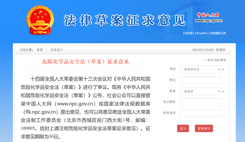 2024年12月25日,全國人大在線對7件法律草案公開征求意見,其中就包括《危險化學品安全法》!意見征求時間為:2024年12月25日至2025年1月23日。