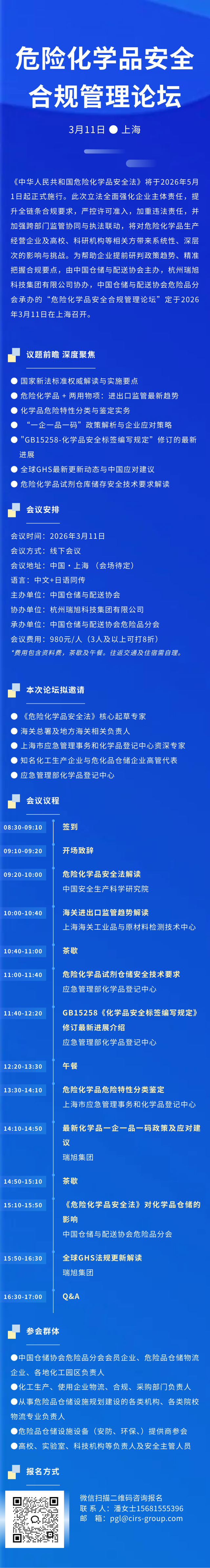 《中華人民共和國危險化學品安全法》將于2026年5月1日起正式施行。此次立法全面強化企業主體責任,提升全鏈條合規要求,嚴控許可準入,加重違法責任,并加強跨部門監管協同與執法聯動,將對危險化學品生產經營企業及高校、科研機構等相關方帶來系統性、深層次的影響與挑戰。為幫助企業提前研判政策趨勢、精準把握合規要點,由中國倉儲與配送協會主辦,杭州瑞旭科技集團有限公司協辦,中國倉儲與配送協會危險品分會承辦的“危險化學品安全合規管理論壇”定于2026年3月11日在上海召開。