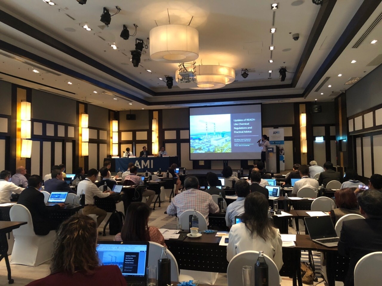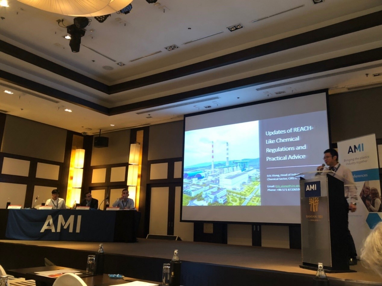 在此次展會上,工業化學品事業部總監熊帆Eric Xiong發表了題為“Compliance of compounding products under REACH-like chemical regulations-from industrial perspective”的演講,介紹了歐盟REACH,中國新化以及韓國K-reach的一般要求、現狀與最新進展,并以聚合物及塑料行業視角就如何進行合規提出了切實可行的建議、對策。