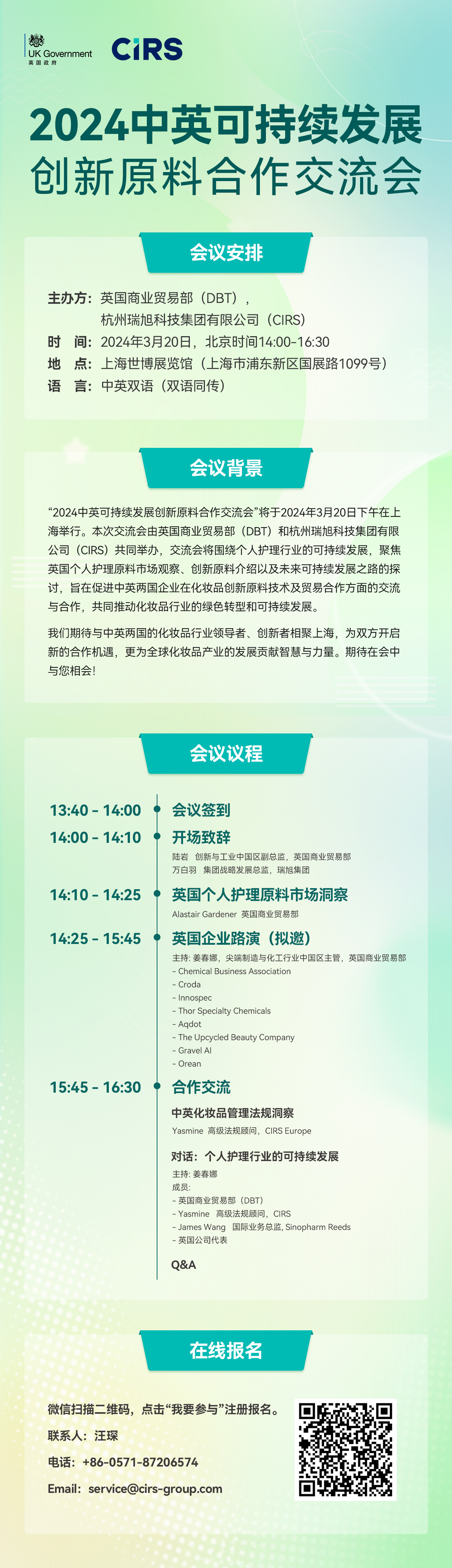 英國商業貿易部將攜手多家英國公司參加于2024 年 3 月 20-22 日舉辦的中國國際化妝品個人及家庭護理用品原料展覽會(Personal Care and Homecare Ingredients, 簡稱PCHi)。展會期間,英國商業貿易部還將與杭州瑞旭科技集團有限公司合作,于3月20日聯合舉辦"中英可持續發展創新原料合作交流會",本次交流會將圍繞個人護理行業的可持續發展,聚焦英國個人護理原料市場觀察、創新原料介紹以及未來可持續發展之路的探討,旨在促進中英兩國企業在化妝品創新原料技術及貿易合作方面的交流與合作,共同推動化妝品行業的綠色轉型和可持續發展。