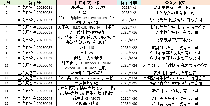 2025年4月取得備案號的16款化妝品新原料,其備案人均位于中國境內。