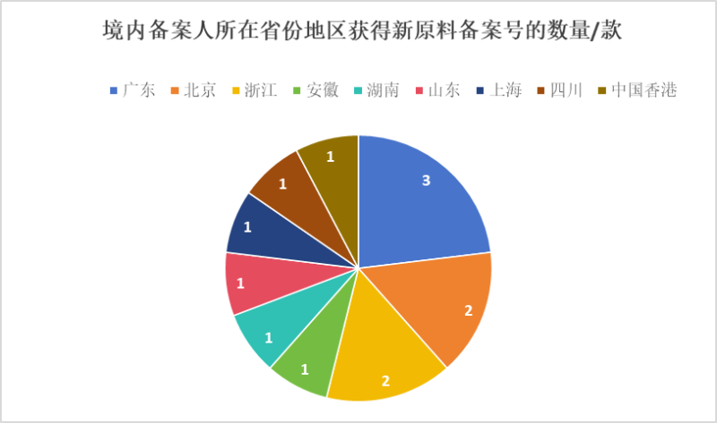 根據對新原料備案數據的分析,13款新原料由中國境內企業完成備案,涉及的13家企業分布于9個省份地區(特別行政區),包括廣東、北京、浙江、安徽、湖南、山東、上海、四川和中國香港。如圖2所示,在所有境內備案企業所屬省份及地區中,廣東省獲得的新原料備案數量最多,為3個,占2025年8月新原料備案企業總備案量的約23%。