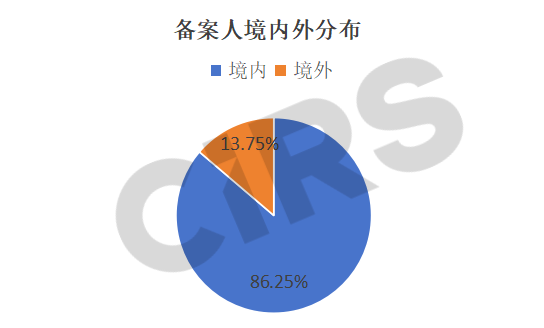 如下圖1所示,2025年上半年取得備案號的80款化妝品新原料,69款化妝品新原料的備案人位于境內地區,占比約86.25%,11款化妝品新原料備案人位于境外地區,占比約13.75%;境內備案人數量遠超境外備案人數量。