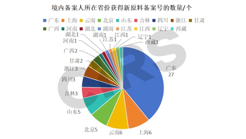 根據對新原料備案數據的分析,69款新原料由中國境內企業完成備案,涉及54家企業,分布于17個省份地區,包括廣東、上海、云南、北京、山東、吉林、四川、浙江、甘肅、廣西、河南、湖北、湖南、江蘇、江西、遼寧和西藏。如下圖2所示,在所有境內備案人所屬省份中,廣東省獲得的新原料備案號數量最多,共計27個,約占2025年上半年境內備案人企業新原料備案總數的39.1%。