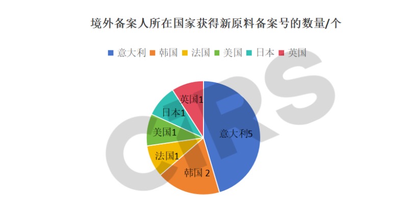 根據對新原料備案數據的分析,11款新原料由中國境外企業完成備案,涉及7家企業,分布于6個國家地區,包括意大利、韓國、法國、美國、日本和英國。如下圖3所示,在所有境外備案人中,意大利企業所獲得的新原料備案號數量最多,共計5個,約占2025年上半年境外備案人企業新原料備案總數的45.5%。