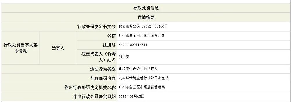 △ 富寶日化行政處罰信息(截圖自廣州市市監局)