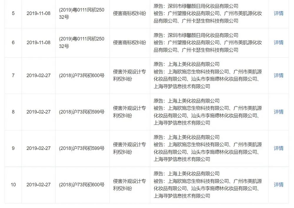 愛企查官網顯示,2019年期間,該公司涉及多起與化妝品相關的侵害商標權、侵害外觀設計專利權的糾紛。