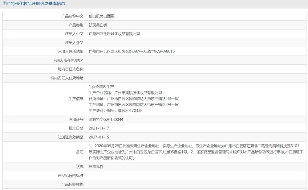 △ 仙白肌美白面膜注冊信息(截圖自藥監局官網)
