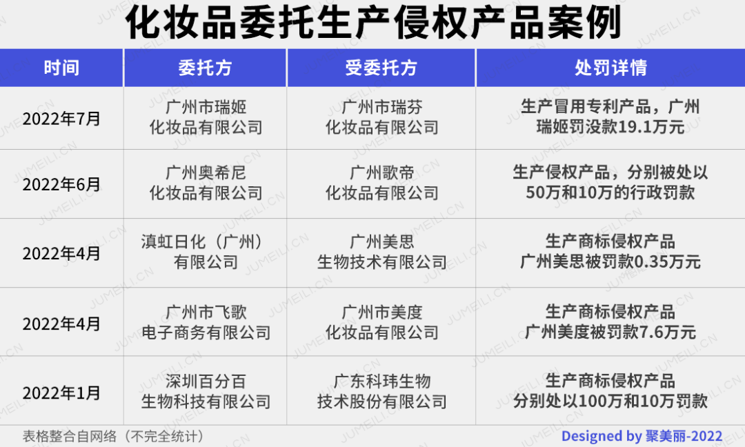 比如,今年6月,HOLDLIVE、戈戈舞、色彩學堂COLOR SCHOOL、TUTU等多個彩妝品牌的母公司廣州奧希尼化妝品有限公司,委托廣州歌帝化妝品有限公司生產的唇膏侵權了完美日記旗下產品,兩家公司分別被處以50萬和10萬的行政罰款。