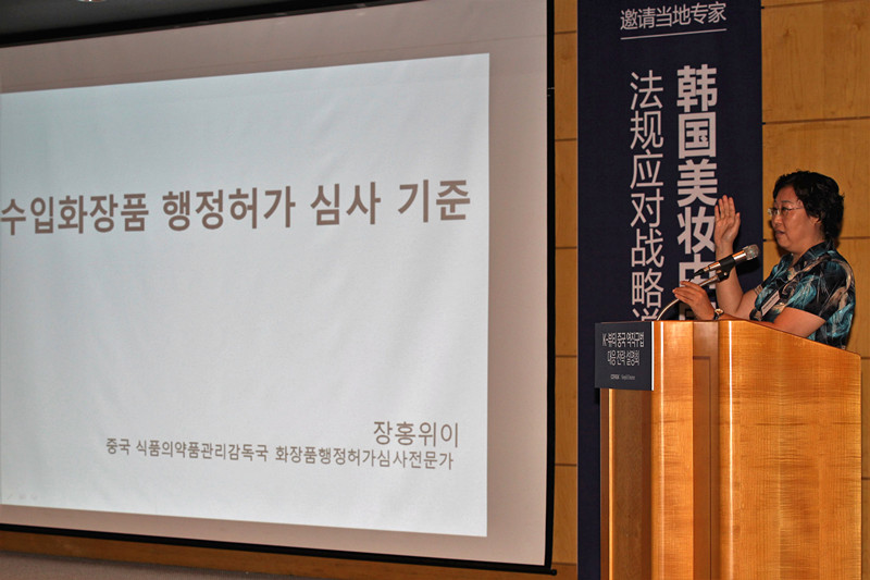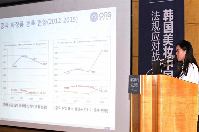 中國食品藥品監督管理局(CFDA)的審查專家以進口化妝品衛生許可的重要性、中國藥監局審查標準為主題,為韓國商家須知的注意事項進行說明。CIRS作為演講嘉賓,根據中國即將提高跨境電商化妝品進口準入門檻的背景下,就韓妝出口企業最關心的韓妝跨境出口現狀、化妝品衛生許可等問題答疑解惑。