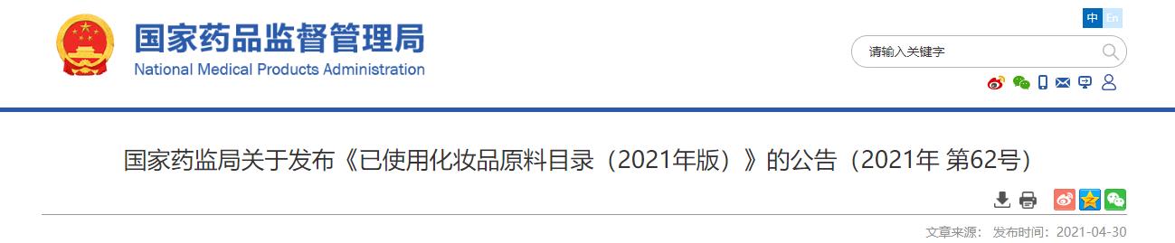 國家藥監局關于發布《已使用化妝品原料目錄(2021年版)》的公告(2021年 第62號)